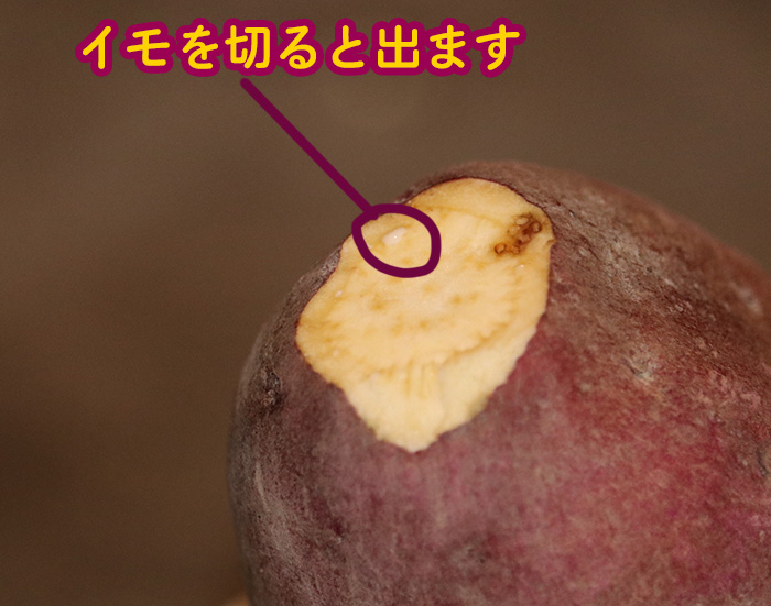 ヤラピンがあふれ出るほどものは新鮮で元気が良いサツマイモの証拠です。購入後に切ってもまだ出てくるのは良いサツマイモの証拠です。